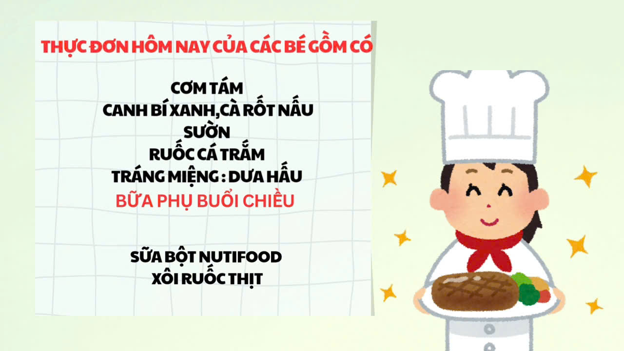 🍲 Thực đơn được thay đổi theo từng ngày, phong phú và hấp dẫn, giúp các con ăn ngon miệng hơn, không bị ngán. Mỗi bữa ăn là sự kết hợp hài hòa giữa tinh bột – đạm – chất béo – vitamin và khoáng chất, hỗ trợ con phát triển chiều cao, cân nặng và tăng cường sức đề kháng.